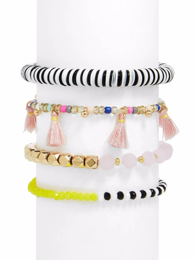 Stacked. Stacked rings were last years it girl look; now the stacked bracelets are back. The difference is the lack of coordination. The stacked bracelets are colorful and chaotic.